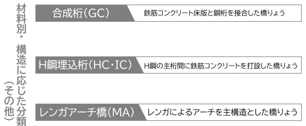 主構造部材がコンクリートと鋼材の両方で構成される、またはどちらの材料も使用しない橋りょうには、以下のようなものがあります。