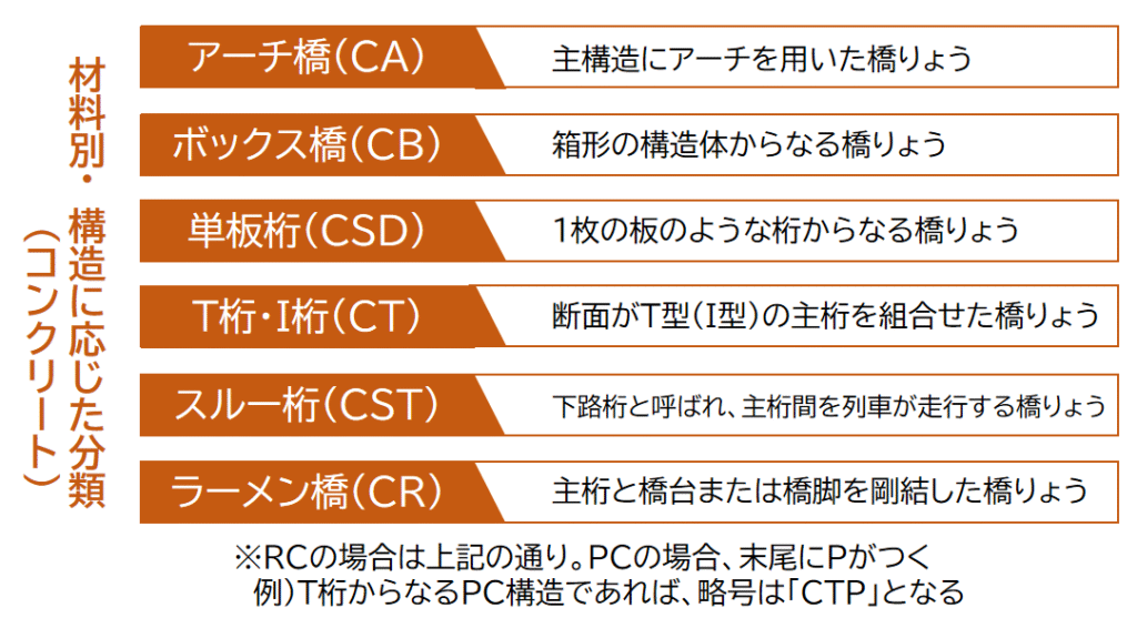 ここで、コンクリート橋にはRC(鉄筋コンクリート)構造と、PC(PC鋼材を設置したコンクリート)構造の2通りがありますが、上記の略記号はRC構造のものです。