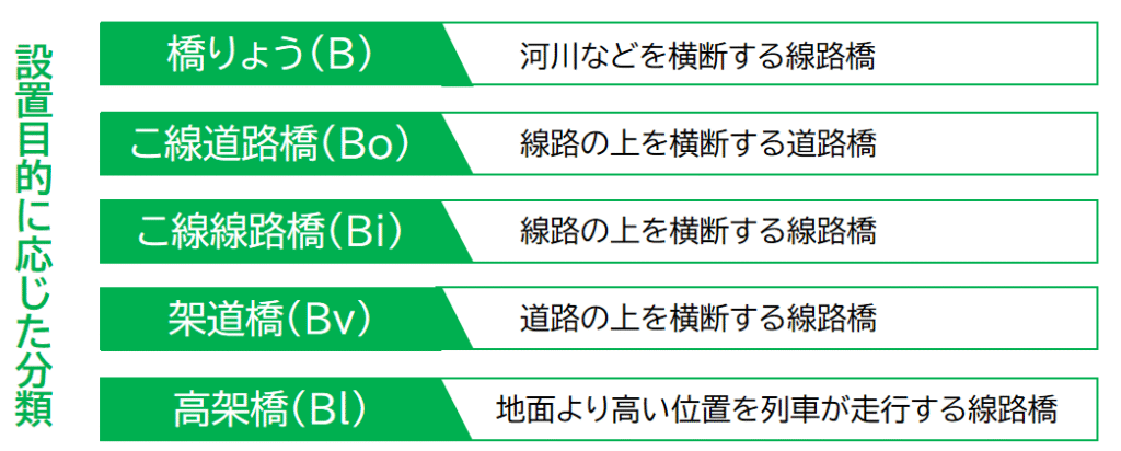 橋りょうの設置目的、すなわち橋りょうが果たしている役割に応じて分類すると、以下の5つになります。
