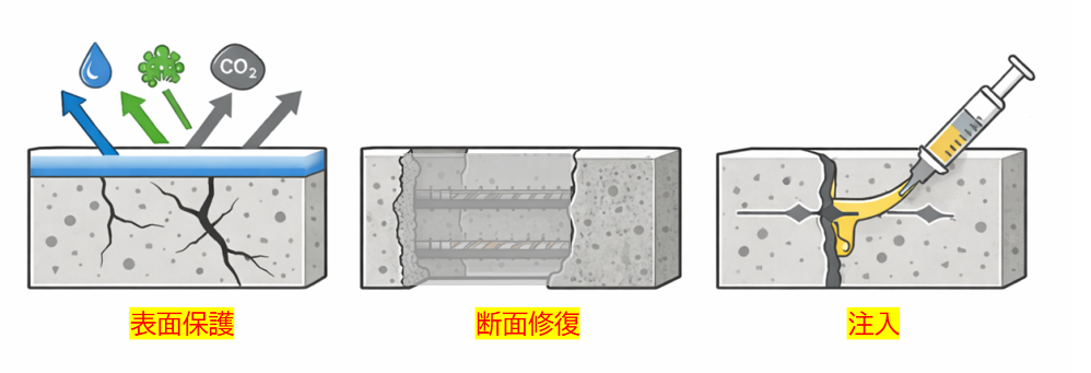 補修の基本は 表面保護・断面修復・ひび割れ修復 の3つですが、劣化原因によってはこれらだけでは不十分な場合があります。